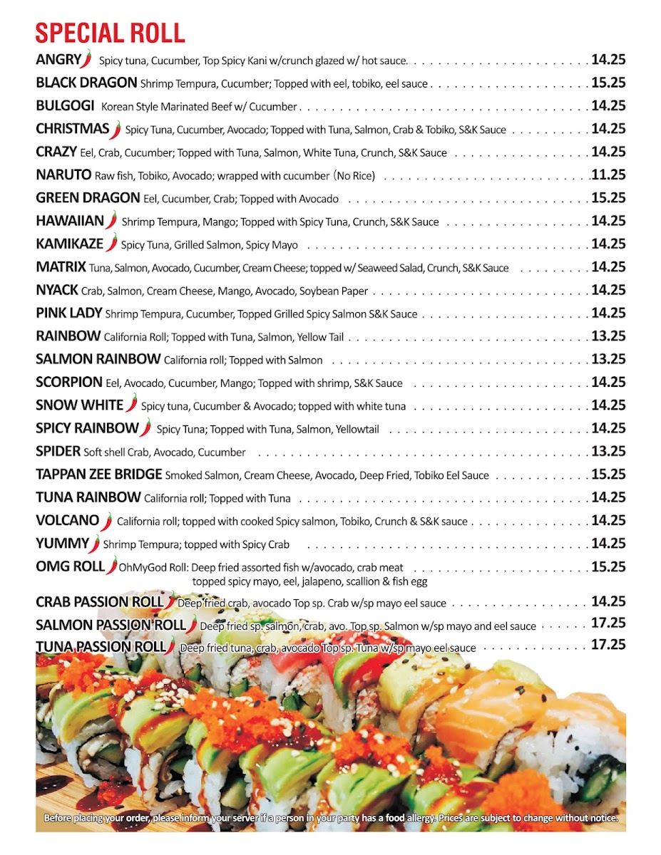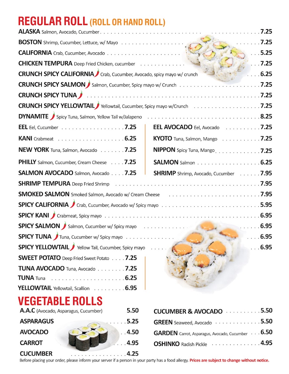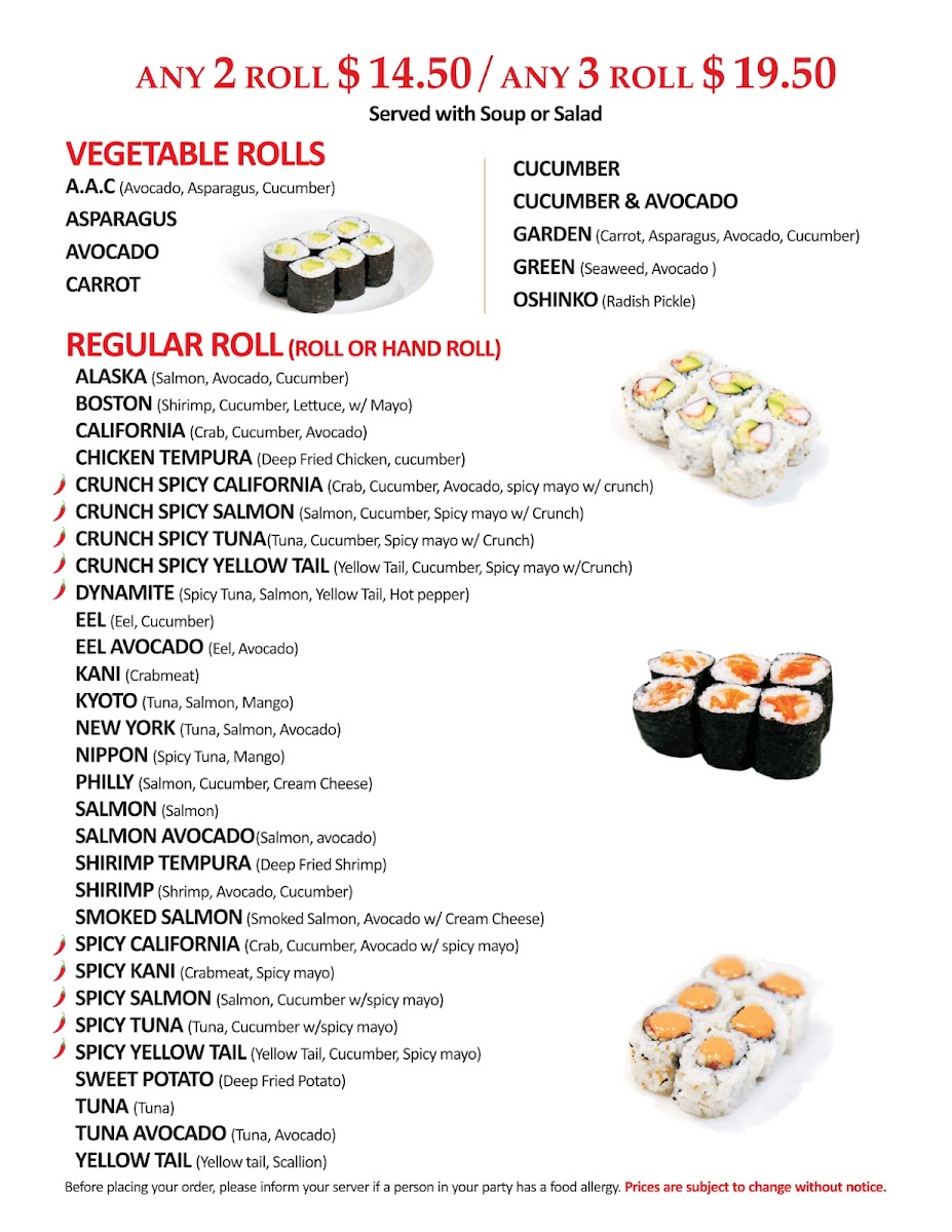 Any three regular rolls (pick from regular and vegetable rolls) served with soup or salad. *