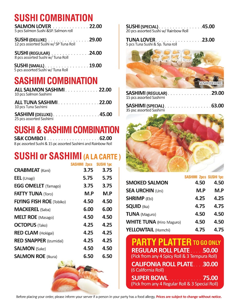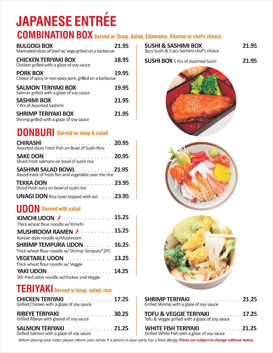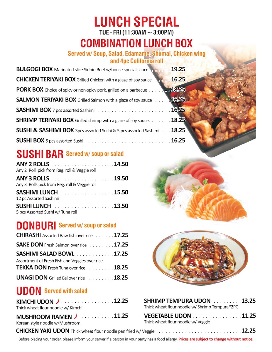 Sliced fresh salmons on bowl of sushi rice. Served with soup and salad. * if you want pickup price is difference.