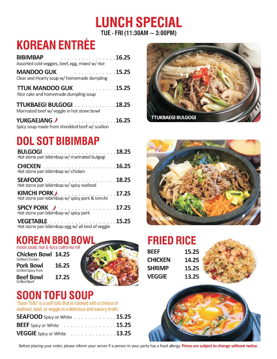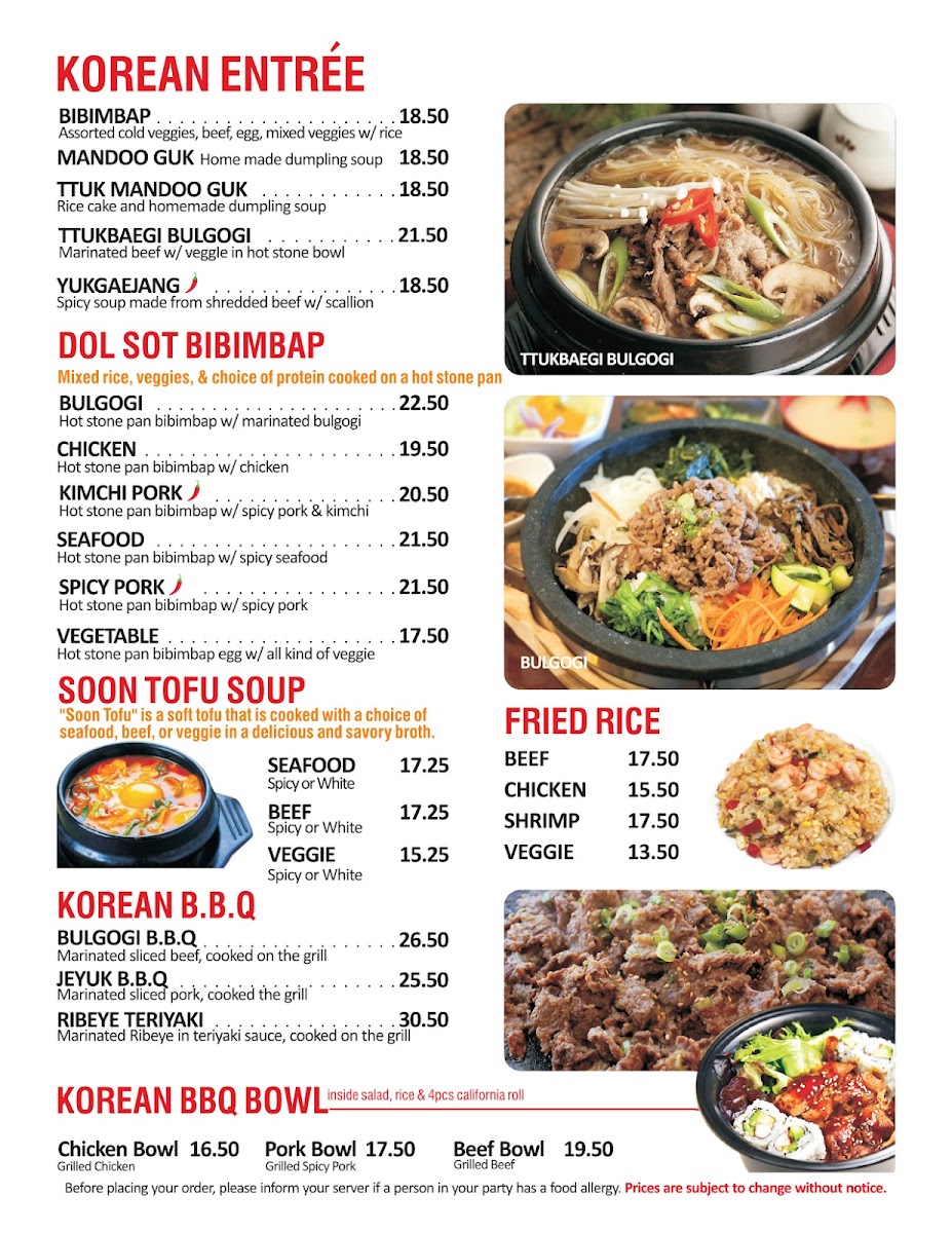 Hot stone pan bibimbap and marinated bulgogi. * if you want pickup price is difference.